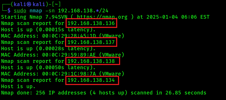 sudo nmap -sn 192.168.138.*/24