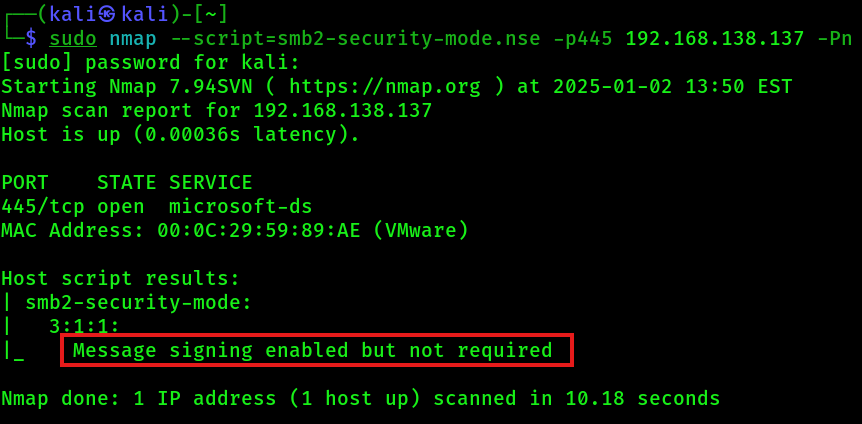 sudo nmap --script=smb2-security-mode.nse -p445 192.168.138.137 -Pn