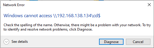 3. Wait till victim tries to connect to an unknown network file share, so that “Windows cannot access \\192.168.138.134” message pops up: