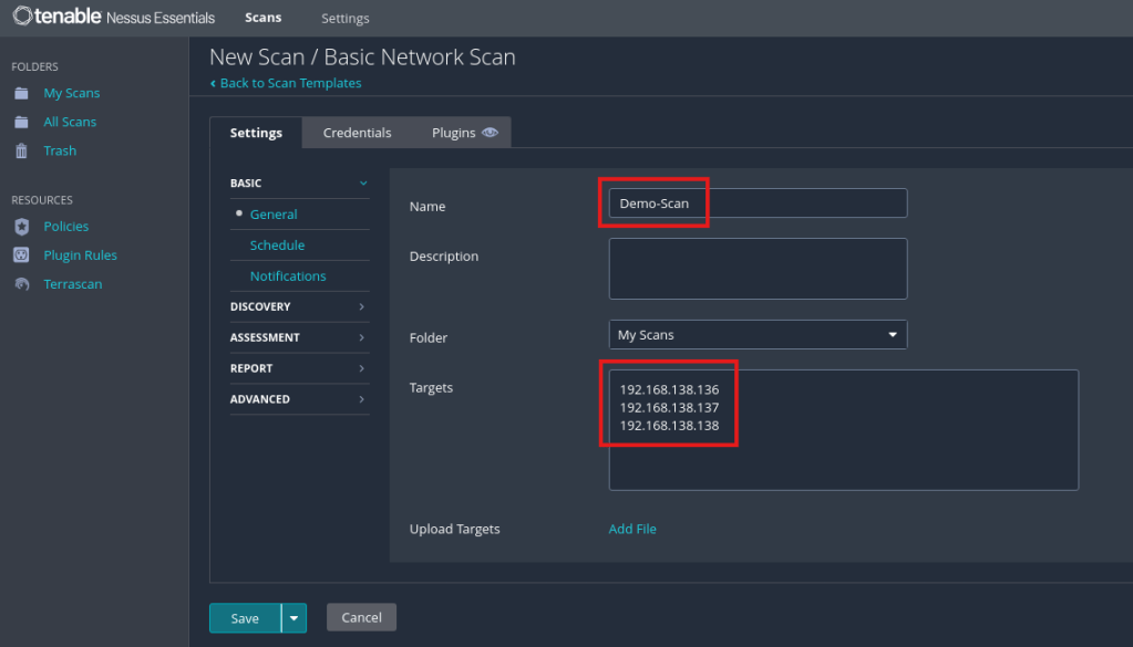1. Click on New Scan and select Basic Network Scan. Enter a name for the scan and all target hosts to scan: