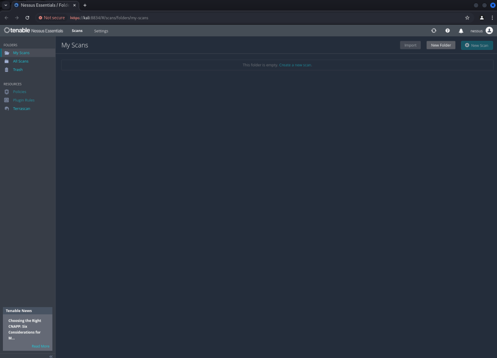 5. Configure the Nessus installation to use Nessus Essentials. For that register a new Tenable Nessus Community Account and get the activation code to process the Nessus Essentials installation. Wait until the installation is complete. You should see the following page: